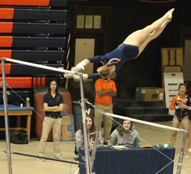 Illini sophomore Mary Jane Horth eyes the high bar as she twists during her Maloney half on bars.